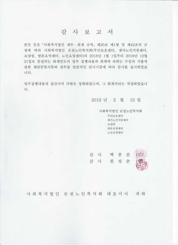 2018년 법인회계감사 보고서 페이지 정보 작성자 은천노인복지회 작성일19-02-27 14:31 조회140,659회 댓글0건 관련링크 이전글 다음글 목록 답변 본문 2018년 법인회계감사 보고서입니다. 이전글 다음글 목록 답변