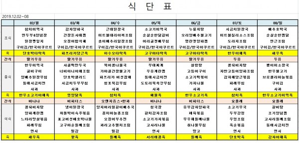12월첫째주식단표 페이지 정보 작성자 은천노인복지회 작성일19-12-02 18:02 조회39,280회 댓글0건 관련링크 이전글 다음글 목록 답변 본문 ※ 모든 식사에는 잡곡밥과 김치가 제공됩니다. ※ 식단은 식재료수급에 의해 변경될 수 있습니다. 이전글 다음글 목록 답변