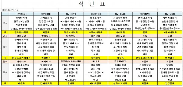 12월 둘재주 식단표 페이지 정보 작성자 은천노인복지회 작성일19-12-06 20:24 조회38,954회 댓글0건 관련링크 이전글 다음글 목록 답변 본문 ※ 모든 식사에는 잡곡밥과 김치가 제공됩니다. ※ 식단은 식재료수급에 의해 변경될 수 있습니다. 이전글 다음글 목록 답변