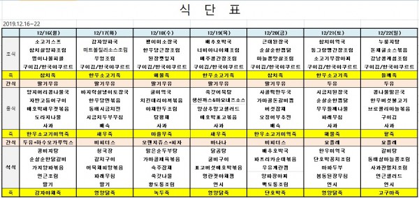 12월 셋째주 식단표 페이지 정보 작성자 은천노인복지회 작성일19-12-15 15:47 조회38,259회 댓글0건 관련링크 이전글 다음글 목록 답변 본문 ※ 모든 식사에는 잡곡밥과 김치가 제공됩니다. ※ 식단은 식재료수급에 의해 변경될 수 있습니다. 이전글 다음글 목록 답변