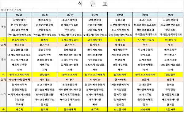 11월 셋째주 식단표 페이지 정보 작성자 은천노인복지회 작성일19-11-15 14:42 조회40,248회 댓글0건 관련링크 이전글 다음글 목록 답변 본문 ※ 모든 식사에는 잡곡밥과 김치가 제공됩니다. ※ 식단은 식재료수급에 의해 변경될 수 있습니다. 이전글 다음글 목록 답변