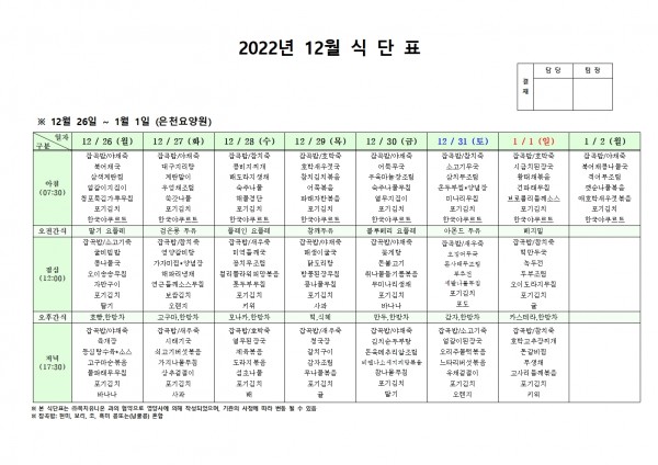 12월 넷째주 식단표 페이지 정보 작성자 은천노인복지회 작성일22-12-26 14:01 조회87,900회 댓글0건 관련링크 이전글 다음글 목록 답변 본문 . 이전글 다음글 목록 답변