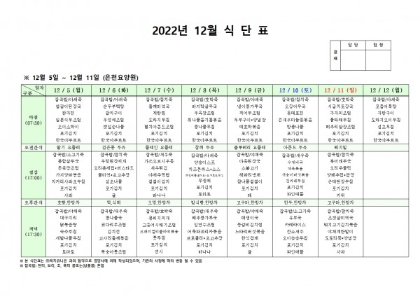 12월 첫째주 식단표 페이지 정보 작성자 은천노인복지회 작성일22-12-01 17:14 조회90,562회 댓글0건 관련링크 이전글 다음글 목록 답변 본문 . 이전글 다음글 목록 답변