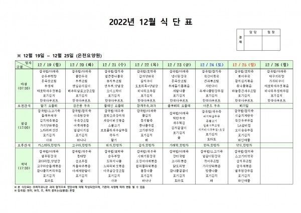 12월 셋째주 식단표 페이지 정보 작성자 은천노인복지회 작성일22-12-16 15:00 조회89,424회 댓글0건 관련링크 이전글 다음글 목록 답변 본문 . 이전글 다음글 목록 답변
