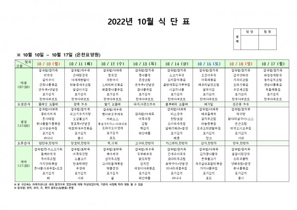 10월 둘째주 식단표 페이지 정보 작성자 은천노인복지회 작성일22-10-06 15:49 조회95,778회 댓글0건 관련링크 이전글 다음글 목록 답변 본문 . 이전글 다음글 목록 답변