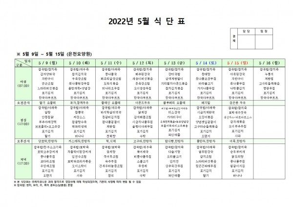 5월 둘째주 식단표 페이지 정보 작성자 은천노인복지회 작성일22-05-06 10:04 조회107,546회 댓글0건 관련링크 이전글 다음글 목록 답변 본문 . 이전글 다음글 목록 답변