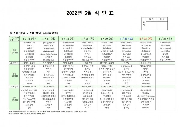 5월 셋째주 식단표 페이지 정보 작성자 은천노인복지회 작성일22-05-12 10:54 조회106,454회 댓글0건 관련링크 이전글 다음글 목록 답변 본문 . 이전글 다음글 목록 답변