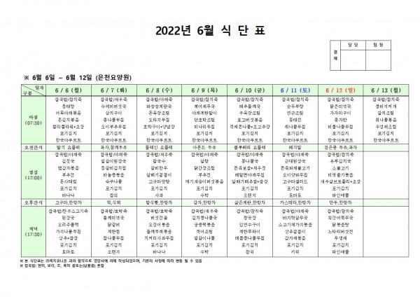 6월 둘째주 식단표 페이지 정보 작성자 은천노인복지회 작성일22-06-03 09:34 조회104,751회 댓글0건 관련링크 이전글 다음글 목록 답변 본문 . 이전글 다음글 목록 답변