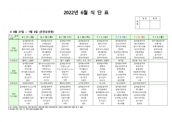 6월 넷째주 식단표 페이지 정보 작성자 은천노인복지회 작성일22-06-23 17:38 조회102,572회 댓글0건 관련링크 이전글 다음글 목록 답변 본문 . 이전글 다음글 목록 답변