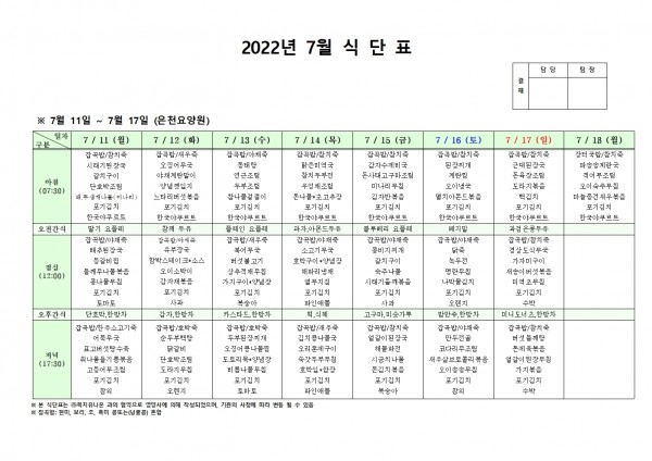 7월 둘째주 식단표 페이지 정보 작성자 은천노인복지회 작성일22-07-07 17:19 조회101,954회 댓글0건 관련링크 이전글 다음글 목록 답변 본문 . 이전글 다음글 목록 답변
