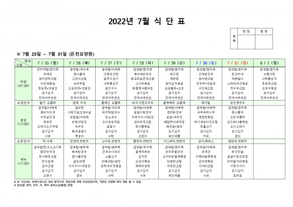 7월 넷째주 식단표 페이지 정보 작성자 은천노인복지회 작성일22-07-21 17:04 조회102,391회 댓글0건 관련링크 이전글 다음글 목록 답변 본문 . 이전글 다음글 목록 답변