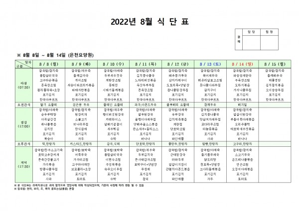 8월 둘째주 식단표 페이지 정보 작성자 은천노인복지회 작성일22-08-04 13:43 조회101,235회 댓글0건 관련링크 이전글 다음글 목록 답변 본문 . 이전글 다음글 목록 답변