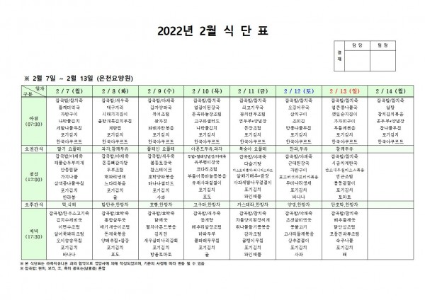 2월 둘째주 식단표 페이지 정보 작성자 은천노인복지회 작성일22-02-04 18:58 조회120,076회 댓글0건 관련링크 이전글 다음글 목록 답변 본문 . 이전글 다음글 목록 답변