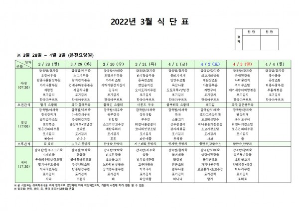 3월 다섯째주 식단표 페이지 정보 작성자 은천노인복지회 작성일22-03-25 10:40 조회113,507회 댓글0건 관련링크 이전글 다음글 목록 답변 본문 . 이전글 다음글 목록 답변
