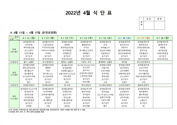 4월 둘째주 식단표 페이지 정보 작성자 은천노인복지회 작성일22-04-11 16:27 조회111,862회 댓글0건 관련링크 이전글 다음글 목록 답변 본문 . 이전글 다음글 목록 답변