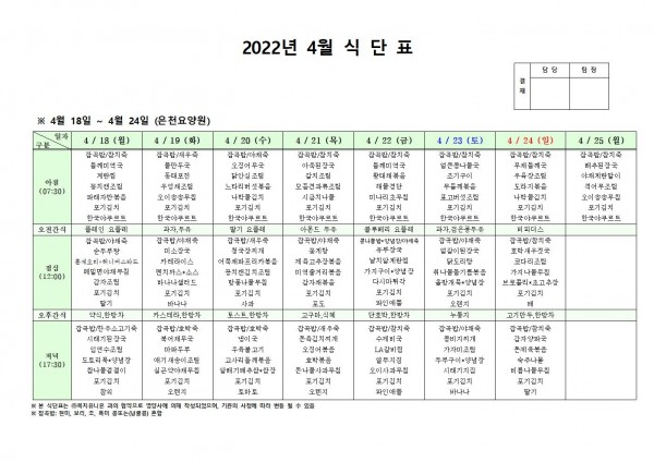 4월 셋째주 식단표 페이지 정보 작성자 은천노인복지회 작성일22-04-14 17:03 조회110,578회 댓글0건 관련링크 이전글 다음글 목록 답변 본문 . 이전글 다음글 목록 답변