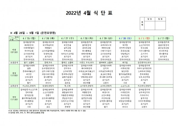4월 넷째주 식단표 페이지 정보 작성자 은천노인복지회 작성일22-04-22 15:56 조회110,342회 댓글0건 관련링크 이전글 다음글 목록 답변 본문 . 이전글 다음글 목록 답변