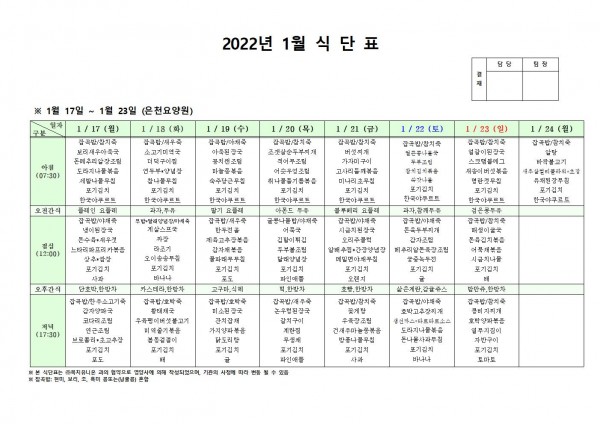 1월 셋째주 식단표 페이지 정보 작성자 은천노인복지회 작성일22-01-25 09:24 조회120,704회 댓글0건 관련링크 이전글 다음글 목록 답변 본문 . 이전글 다음글 목록 답변
