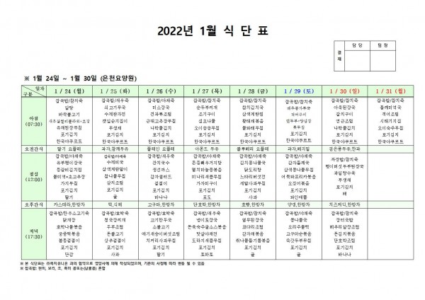 1월 넷째주 식단표 페이지 정보 작성자 은천노인복지회 작성일22-01-25 09:24 조회120,775회 댓글0건 관련링크 이전글 다음글 목록 답변 본문 . 이전글 다음글 목록 답변