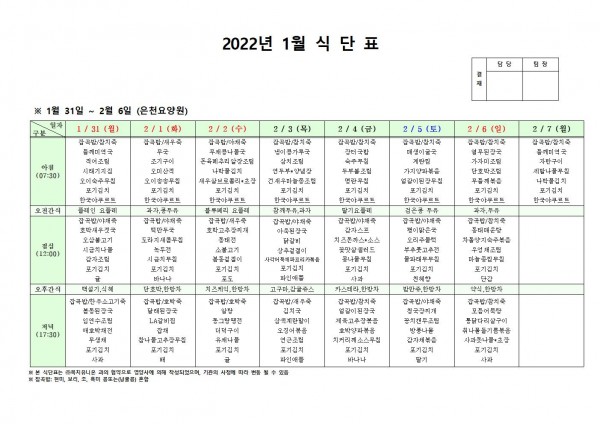 2월 첫째주 식단표 페이지 정보 작성자 은천노인복지회 작성일22-01-29 11:54 조회119,335회 댓글0건 관련링크 이전글 다음글 목록 답변 본문 . 이전글 다음글 목록 답변