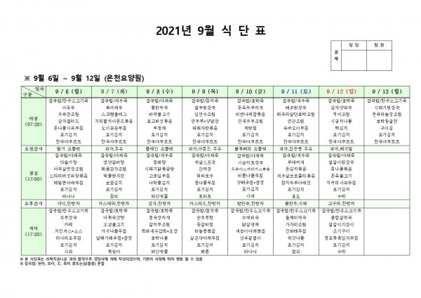9월 둘째주 식단표 페이지 정보 작성자 은천노인복지회 작성일21-09-02 16:30 조회129,288회 댓글0건 관련링크 이전글 다음글 목록 답변 본문 . 이전글 다음글 목록 답변
