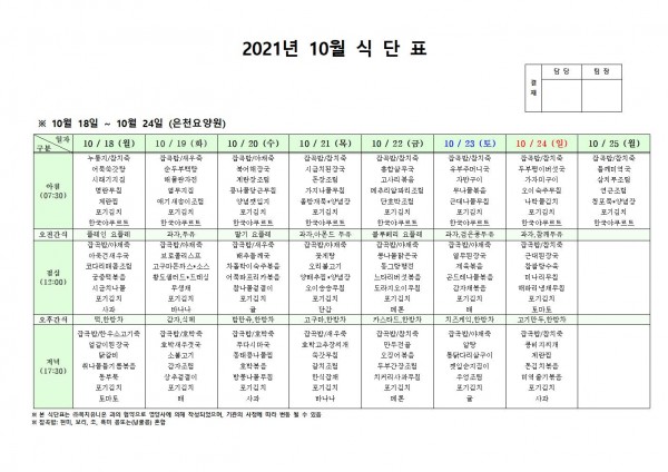 10월 셋째주 식단표 페이지 정보 작성자 은천노인복지회 작성일21-10-14 16:24 조회126,631회 댓글0건 관련링크 이전글 다음글 목록 답변 본문 . 이전글 다음글 목록 답변