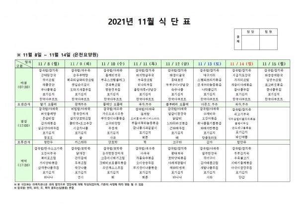 11월 둘째주 식단표 페이지 정보 작성자 은천노인복지회 작성일21-11-04 16:57 조회126,873회 댓글0건 관련링크 이전글 다음글 목록 답변 본문 . 이전글 다음글 목록 답변