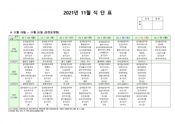 11월 셋째주 식단표 페이지 정보 작성자 은천노인복지회 작성일21-11-25 17:11 조회126,460회 댓글0건 관련링크 이전글 다음글 목록 답변 본문 . 이전글 다음글 목록 답변