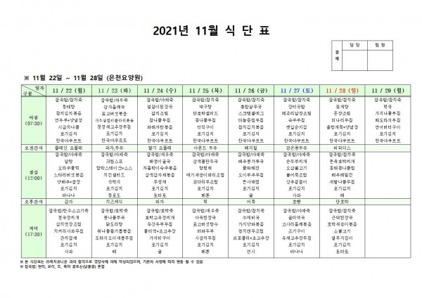 11월 넷째주 식단표 페이지 정보 작성자 은천노인복지회 작성일21-11-25 17:12 조회125,850회 댓글0건 관련링크 이전글 다음글 목록 답변 본문 . 이전글 다음글 목록 답변