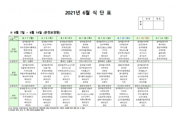 6월 둘째주 식단표 페이지 정보 작성자 은천노인복지회 작성일21-06-03 17:20 조회135,102회 댓글0건 관련링크 이전글 다음글 목록 답변 본문 . 이전글 다음글 목록 답변