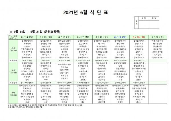 6월 셋째주 식단표 페이지 정보 작성자 은천노인복지회 작성일21-06-11 10:28 조회134,547회 댓글0건 관련링크 이전글 다음글 목록 답변 본문 . 이전글 다음글 목록 답변