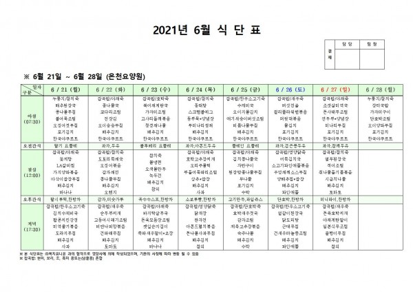 6월 넷째주 식단표 페이지 정보 작성자 은천노인복지회 작성일21-06-17 15:01 조회134,160회 댓글0건 관련링크 이전글 다음글 목록 답변 본문 . 이전글 다음글 목록 답변