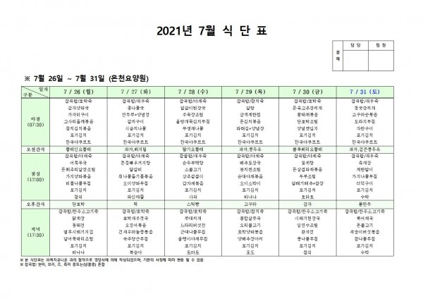 7월 넷째주 식단표 페이지 정보 작성자 은천노인복지회 작성일21-08-05 10:26 조회132,197회 댓글0건 관련링크 이전글 다음글 목록 답변 본문 . 이전글 다음글 목록 답변