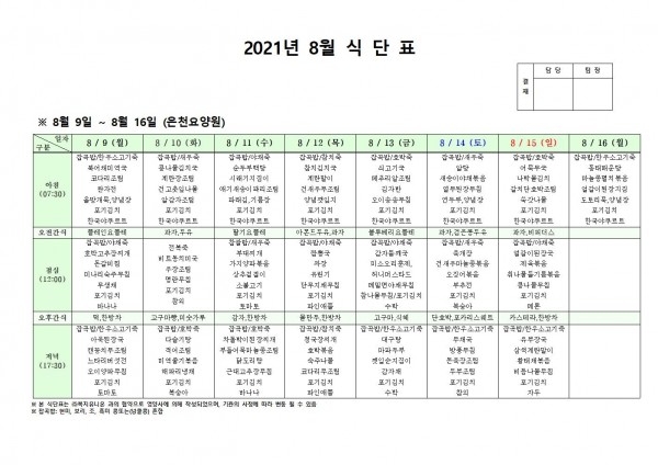 8월 둘째주 식단표 페이지 정보 작성자 은천노인복지회 작성일21-08-12 15:05 조회132,315회 댓글0건 관련링크 이전글 다음글 목록 답변 본문 . 이전글 다음글 목록 답변