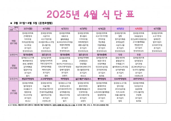 2025년 4월 첫주 식단표 페이지 정보 작성자 은천노인복지회 작성일25-03-28 10:25 조회14,167회 댓글0건 관련링크 이전글 다음글 목록 답변 본문 . 이전글 다음글 목록 답변