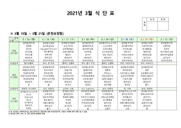 3월 셋째주 식단표 페이지 정보 작성자 은천노인복지회 작성일21-03-12 11:41 조회144,255회 댓글0건 관련링크 이전글 다음글 목록 답변 본문 3월 셋째주 식단표[이 게시물은 은천노인복지회님에 의해 2021-03-12 17:18:24 공지사항에서 이동 됨] 이전글 다음글 목록 답변
