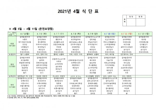 4월 첫째주 식단표 페이지 정보 작성자 은천노인복지회 작성일21-04-01 18:24 조회142,009회 댓글0건 관련링크 이전글 다음글 목록 답변 본문 4월 첫째주 식단표 이전글 다음글 목록 답변