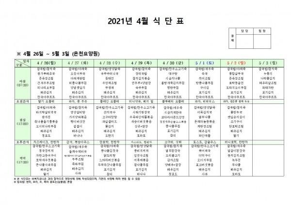 4월 넷째주 식단표 페이지 정보 작성자 은천노인복지회 작성일21-04-22 18:32 조회138,745회 댓글0건 관련링크 이전글 다음글 목록 답변 본문 식단표 이전글 다음글 목록 답변