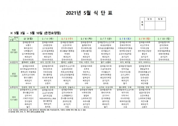 5월 첫째주 식단표 페이지 정보 작성자 은천노인복지회 작성일21-05-03 13:44 조회138,692회 댓글0건 관련링크 이전글 다음글 목록 답변 본문 5월 식단표 이전글 다음글 목록 답변
