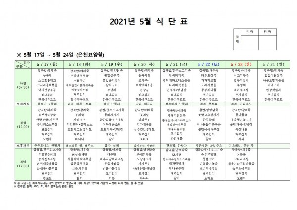 5월 셋째주 식단표 페이지 정보 작성자 은천노인복지회 작성일21-05-13 19:27 조회136,942회 댓글0건 관련링크 이전글 다음글 목록 답변 본문 5월 셋째주 식단표 이전글 다음글 목록 답변