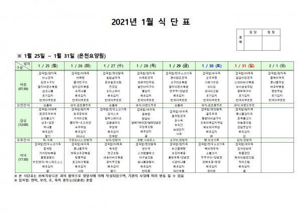 1월 넷째주 식단표 페이지 정보 작성자 은천노인복지회 작성일21-01-22 10:43 조회148,886회 댓글0건 관련링크 이전글 다음글 목록 답변 본문 . 이전글 다음글 목록 답변