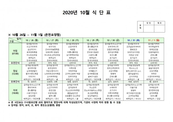 10월 넷째주 식단표 페이지 정보 작성자 은천노인복지회 작성일20-11-13 13:47 조회157,524회 댓글0건 관련링크 이전글 다음글 목록 답변 본문 . 이전글 다음글 목록 답변