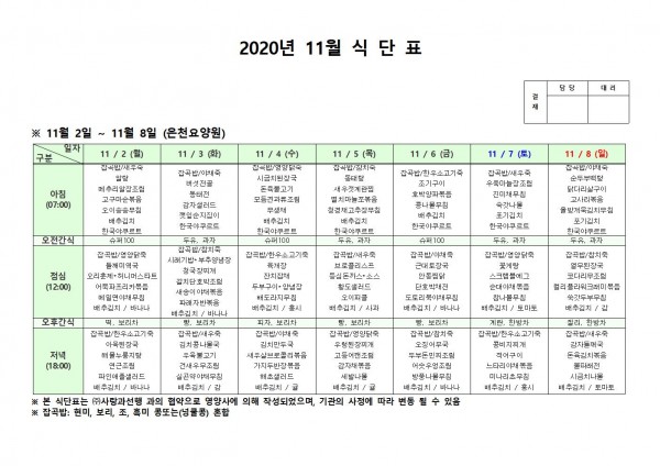 11월 첫째주 식단표 페이지 정보 작성자 은천노인복지회 작성일20-11-13 13:47 조회157,059회 댓글0건 관련링크 이전글 다음글 목록 답변 본문 . 이전글 다음글 목록 답변