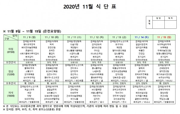 11월 둘째주 식단표 페이지 정보 작성자 은천노인복지회 작성일20-12-08 18:09 조회155,515회 댓글0건 관련링크 이전글 다음글 목록 답변 본문 11월 둘째주 식단표 이전글 다음글 목록 답변