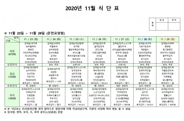 11월 넷째주 식단표 페이지 정보 작성자 은천노인복지회 작성일20-12-08 18:10 조회154,403회 댓글0건 관련링크 이전글 다음글 목록 답변 본문 . 이전글 다음글 목록 답변