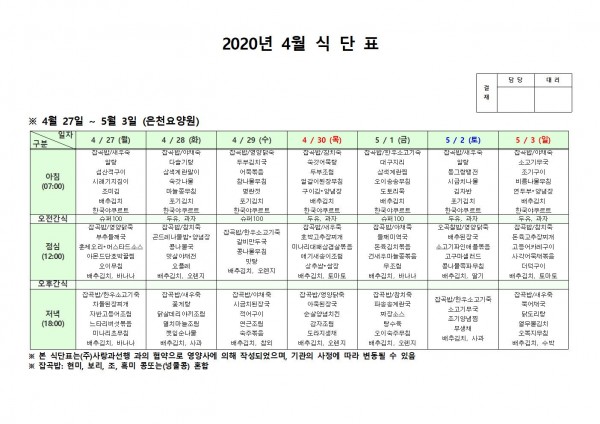 4월 넷째주 식단표 페이지 정보 작성자 은천노인복지회 작성일20-05-04 15:11 조회175,178회 댓글0건 관련링크 이전글 다음글 목록 답변 본문 . 이전글 다음글 목록 답변