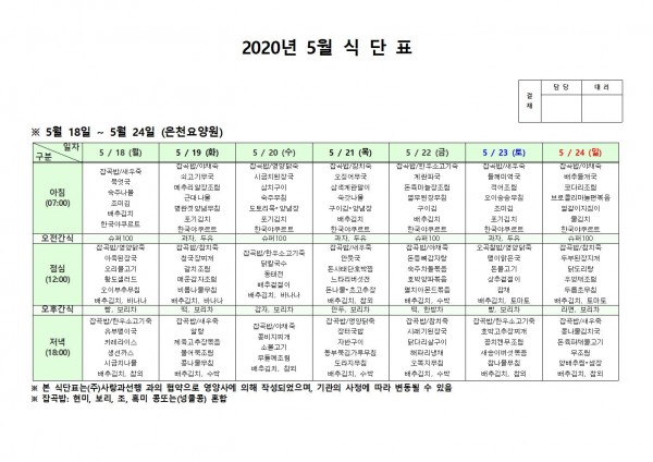 5월 셋째주 식단표 페이지 정보 작성자 은천노인복지회 작성일20-05-26 12:00 조회171,687회 댓글0건 관련링크 이전글 다음글 목록 답변 본문 . 이전글 다음글 목록 답변