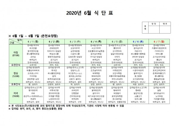 6월 첫째주 식단표 페이지 정보 작성자 은천노인복지회 작성일20-06-09 09:32 조회171,094회 댓글0건 관련링크 이전글 다음글 목록 답변 본문 호 이전글 다음글 목록 답변