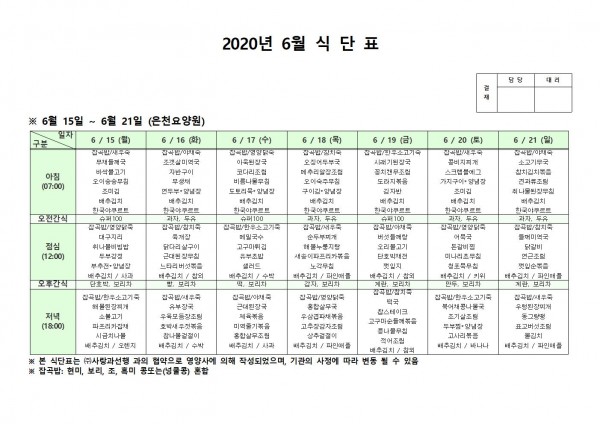 6월 셋째주 식단표 페이지 정보 작성자 은천노인복지회 작성일20-06-22 16:16 조회169,392회 댓글0건 관련링크 이전글 다음글 목록 답변 본문 . 이전글 다음글 목록 답변