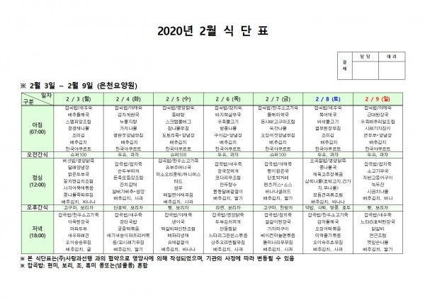 2월 첫째주 식단표 페이지 정보 작성자 은천노인복지회 작성일20-02-11 10:22 조회183,146회 댓글0건 관련링크 이전글 다음글 목록 답변 본문 . 이전글 다음글 목록 답변